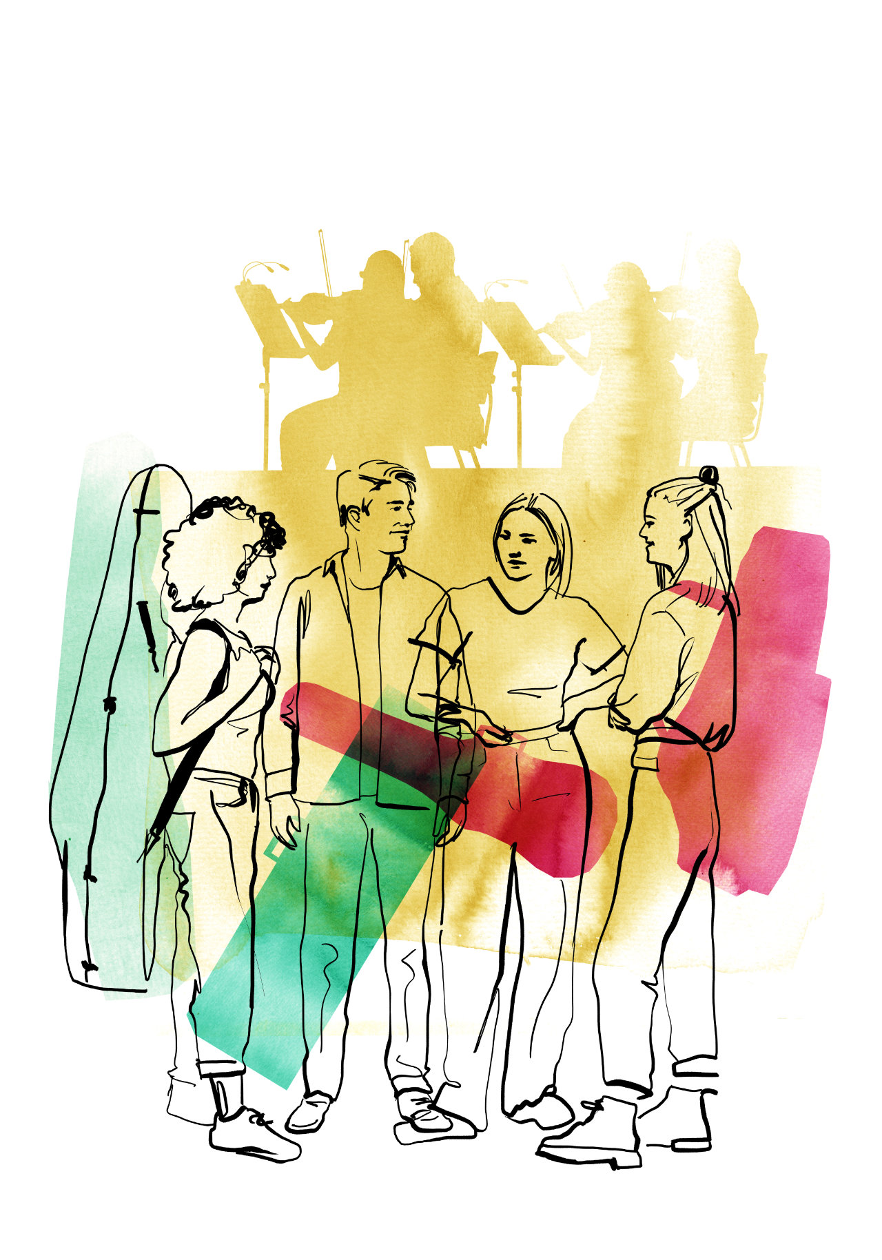 Inom pilotregionerna kontaktas några utvalda kulturskolor och vuxenorkestrar. Genom dessa och andra kanaler söker vi upp ungdomar som önskar fortsätta spela i orkester men inte hittat rätt. Utifrån behov erbjuder Musikerbron insatser som främjar samverkan och inslussning av ungdomar i orkestrarna. Anpassade arrangemang och kompositioner kommer beställas, fortbildning genomföras m.m. Saknas lämplig orkester utifrån behoven erbjuds kunskap, material och inspiration när ungdomar vill starta upp en ny orkester. Vi startar mötesplatser där ungdomar får utrymme för egna idéer och behov och får fördjupad kunskap inom hållbar musikerhälsa och praktiska tips som rör orkesterverksamhet, samt möjlighet till mentorskap. Ungdomar får testa och utvärdera material och strategier och medskapa verktyg för hur en orkester kan jobba med rekrytering av unga. Metodmaterial utvecklas och presenteras 2027/28. Spridning sker sen genom exempelvis digital plattform, tryckt material och film, förbundets medlemstidning, sociala medier och inte minst genom ungdomars kunskap och support för att själva kunna agera mentor till nya ungdomar.