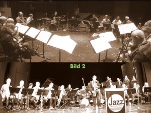 Man har nu laborerat med att placera sig utmed väggarna, i kvadrat, på repetitionerna. Och att flytta saxofonsektionen så dom inte sitter med övriga blåsare direkt bakom sig (bild 2). Ett smart sätt att skona hörseln något! Även Norrbotten Big Band har prövat liknande placeringar för att minska riskerna för hörselskador. Tummen upp för dessa orkestrar som vågar bryta traditionella placeringar och sätta hörseln främst!