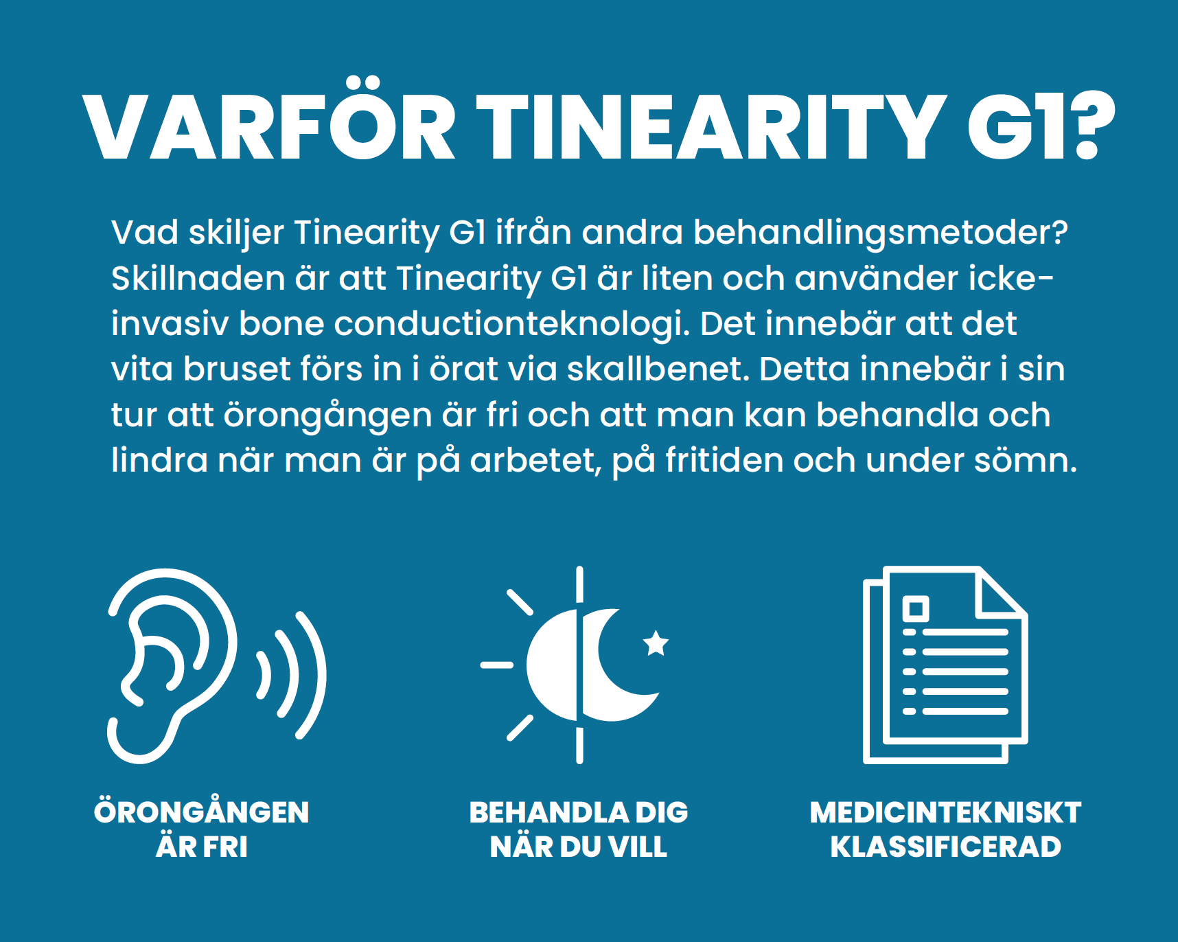 Vad skiljer Tinearity G1 ifrån andra behandlingsmetoder? Skillnaden är att Tinearity G1 är liten och använder ickeinvasiv bone conductionteknologi. Det innebär att detvita bruset förs in i örat via skallbenet. Detta innebär i sin tur att örongången är fri och att man kan behandla och lindra när man är på arbetet, på fritiden och under sömn.