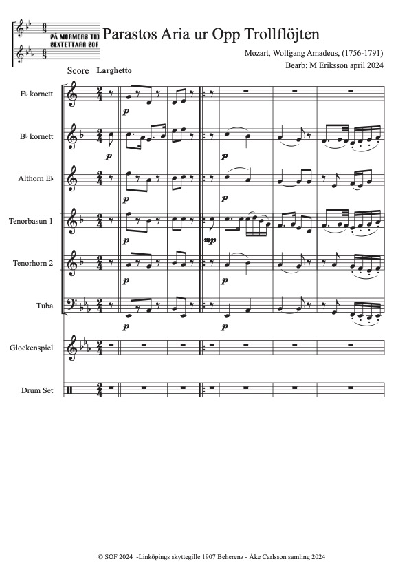 Mozart, Wolfgang Amadeus, (1756-1791) Bearb: M Eriksson / Solo tenorbasun Åke Carlsson samling donerad 2024 arr; Carl Johan Beherndtz (1842-1923)